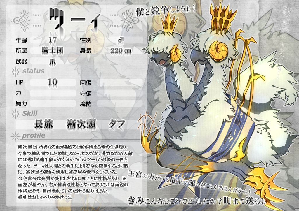 【4期】ツーィ詳細 【七つの国】ツーィ【第4期】 【お嫁さん:青の国ルルベル】 * * *天敵怖さに逃げて逃げて生き延びてきた。漸次竜最後の生き残り。 もふもふなおかげで白の国では寒いもの知らず…かとおも...